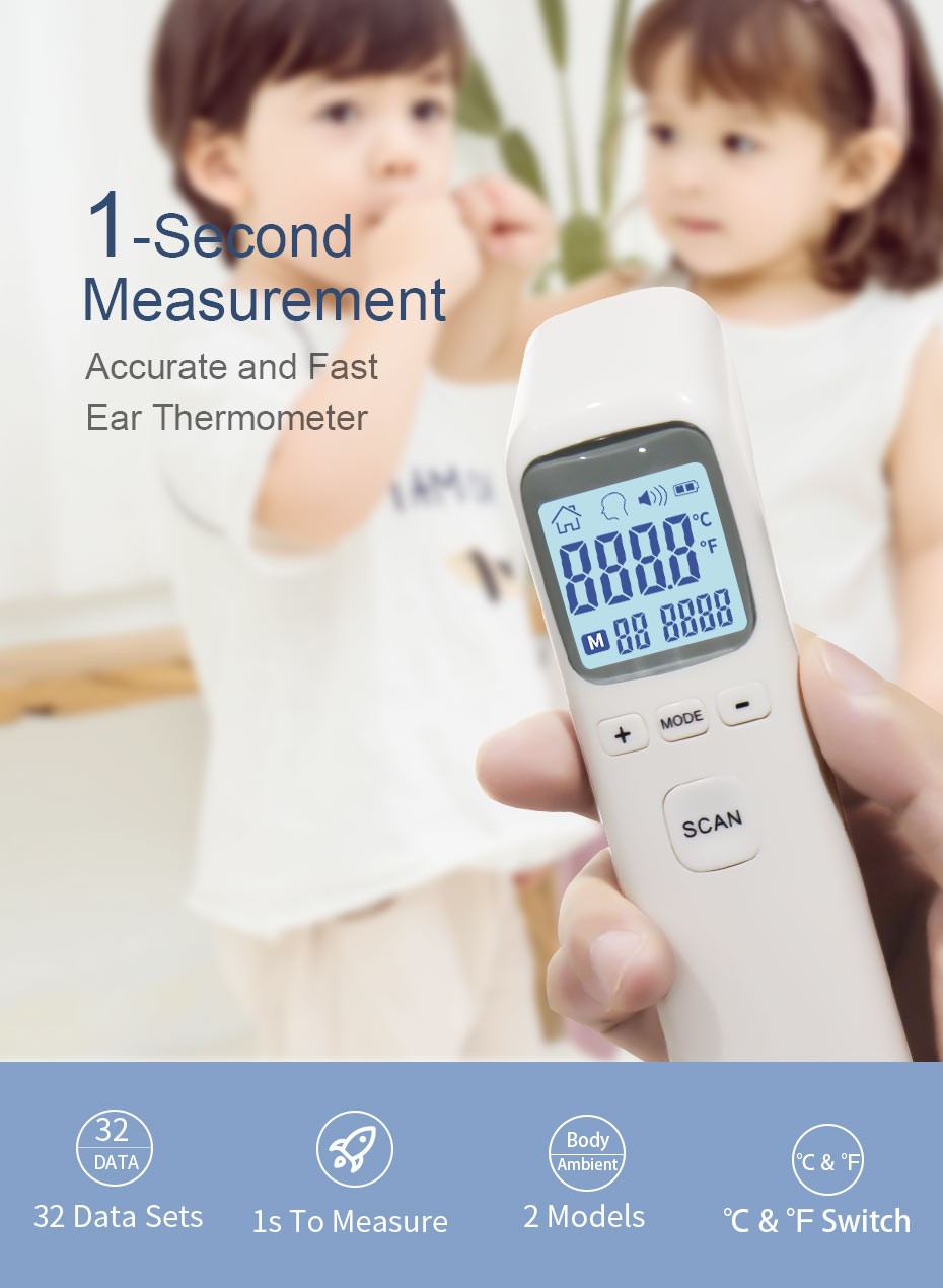 Безконтактен дизайн Това ще бъде по-санитарно, потенциално ще намали разпространението на бактерии или инфекция. Дръжте сензора между 3 - 5 см от кожата и ще получите добро четене Прецизна технология за четене Приемете усъвършенстваната технология, гарантирайте, че безконтактният термометър дава постоянни измервания с точност от +/- 0,2 Deg.C Бързо и лесно Това е в състояние да покаже четете в рамките на 1 секунда, което е голямо предизвикателство за обикновен живачен термометър. Целзий и Фаренхайт се превключват лесно и мигновено от превключващия се LCD дисплей, а Fever Alarm White подсветката осигурява приятен блясък за лесно четене в нощни или тъмни ситуации. И ще бъде подаден звуков сигнал, ако измерената телесна температура е над температурата на алармата за треска, можете да регулирате температурата на алармата за треска в РЕЖИМ Още операции Няма нужда да записвате последната записана температура по време на треска, този термометър има вградена памет, която може да записвайте до 32 показания, направени по всяко време